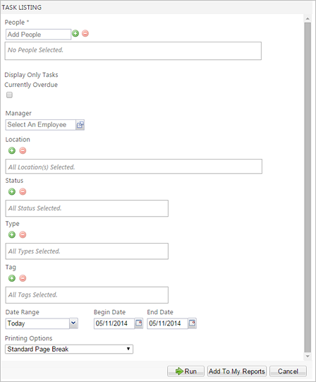 This report provides a complete list of all the tasks that are due within a selected date range. Use this report to see all tasks assigned to a manager's team members, all tasks with a particular status, or all tasks with a particular category tag.
