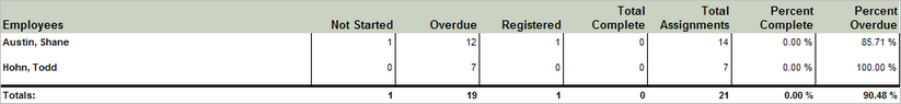 - Completed assignments (displayed as a count and as a percentage). The Total Complete and Percent Complete columns include both assignments trainees completed and assignments that a manager marked complete for them.