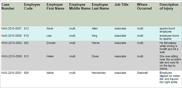 Events that are associated with more than one injury are grouped together using an alternating background color. This allows you to distinguish between events with multiple associated injuries.