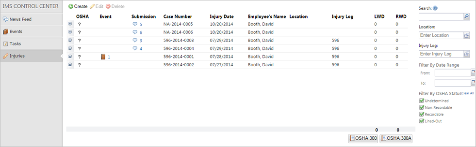 The Injuries screen displays all the injuries that have been submitted in IMS. You can use the Injuries screen to create, edit, and track injuries resulting from workplace incidents.