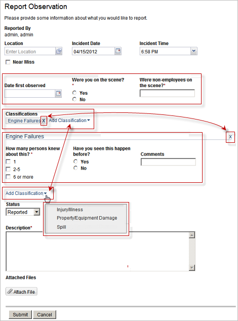 The image demonstrates an incident that has three custom unclassified fields (shown in the first highlighted area). Below that area is the classification that has been selected (a custom classification called Engine Failures) with three custom fields (as shown in the second and third highlighted area). The user has selected Add Classification and the list displays only the unused classifications (as shown in the fourth highlighted area). The Add Classification field is available in two locations. This makes it easy to locate whether you are near the top or the bottom of multiple classifications. You can also remove a classification using one of the two X selections. |