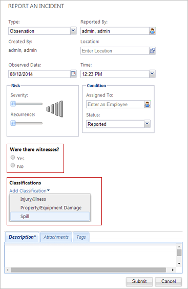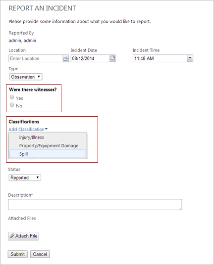When checked, the incident will be submitted anonymously. Once you click the Submit button, the system replaces your name in the Reported By field with the word Anonymous. This check box is available only if you have the appropriate permissions. |