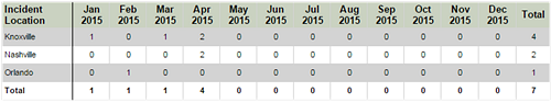 The grid shows the number of submissions per location or classification that are included in the report. Configure the grid to display counts by month, quarter or year based on your selection in the Subtotals parameter.