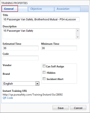 Option Description Vendor Displays the vendor of the training. Brand Displays the brand of the training. Instant Training URL and QR Code link These links are specific to the training that is being viewed. URL. You can copy and paste the URL link into an email. This allows trainee recipients to simply click the link and login to PureSafety. They can start the training (single training unit assignments), register for the training (offline assignments), or add it to their home page (courses, lessons, or curriculum assignments).